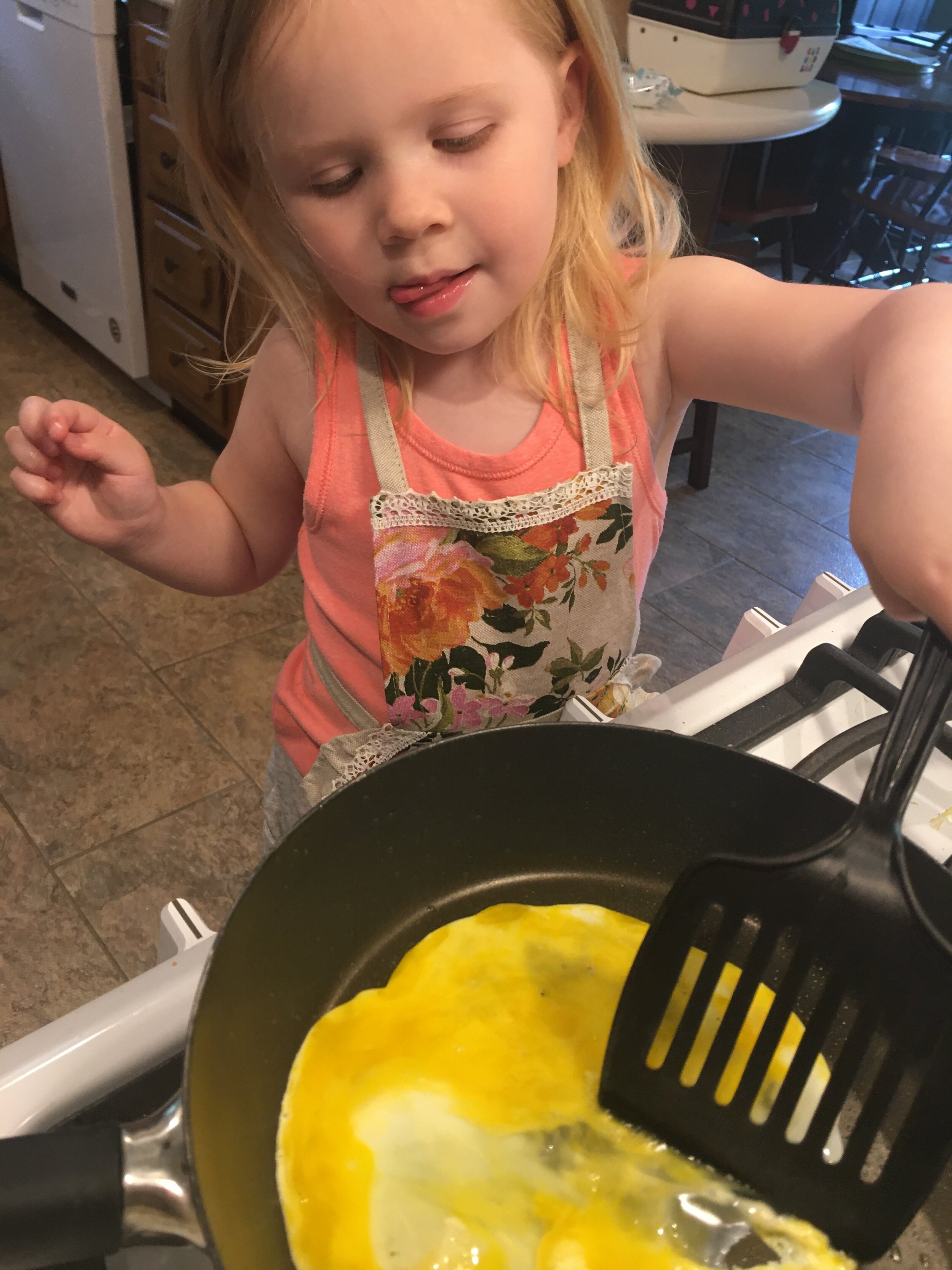 We actually make eggs pretty regularly now! She is really good at it and she will eat all of her eggs which makes me really happy. In true Salfelder fashion, she does like ketchup with her eggs too! ❤
