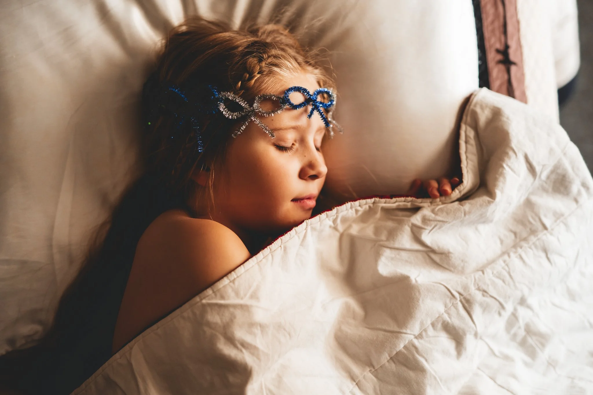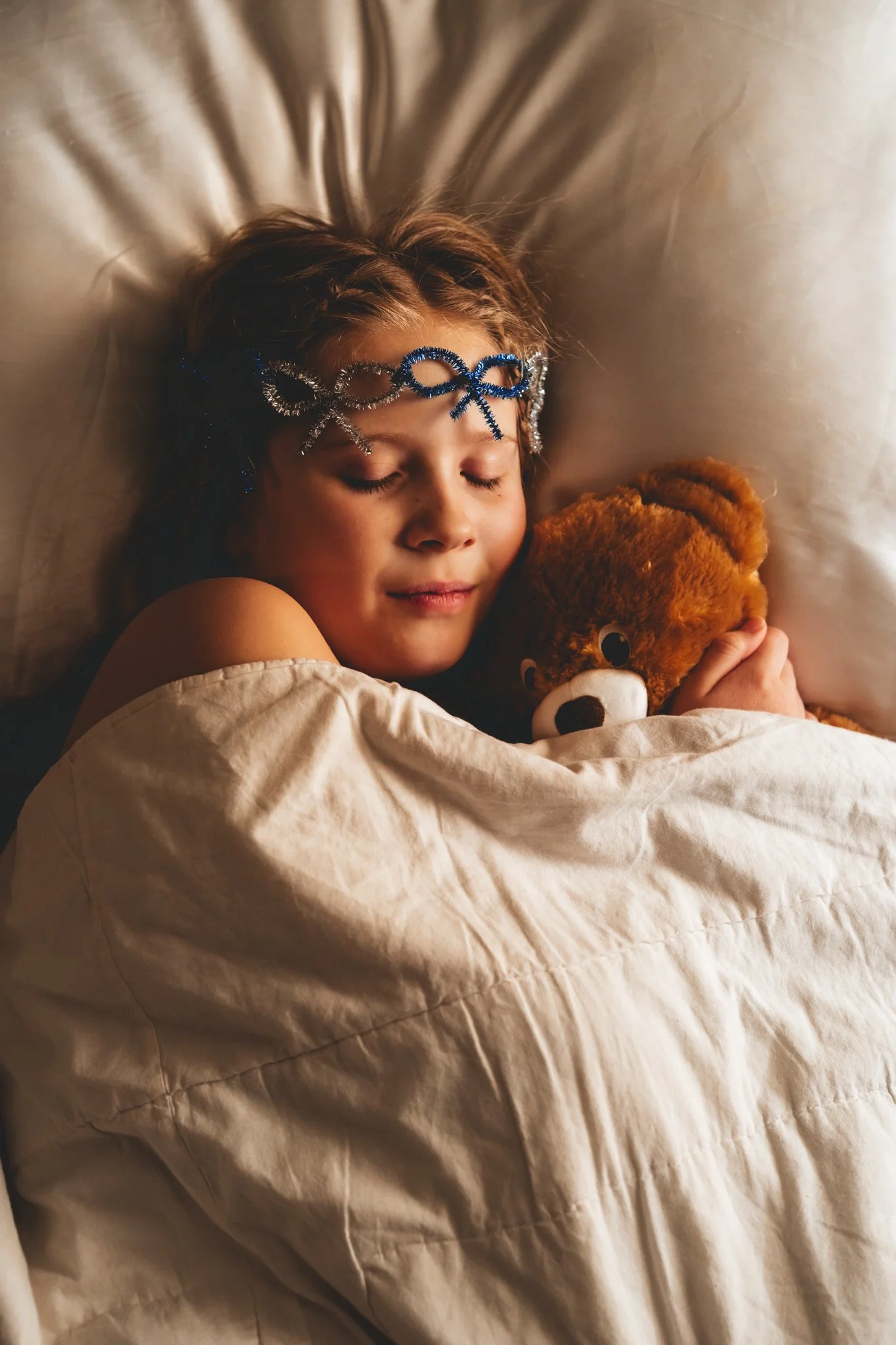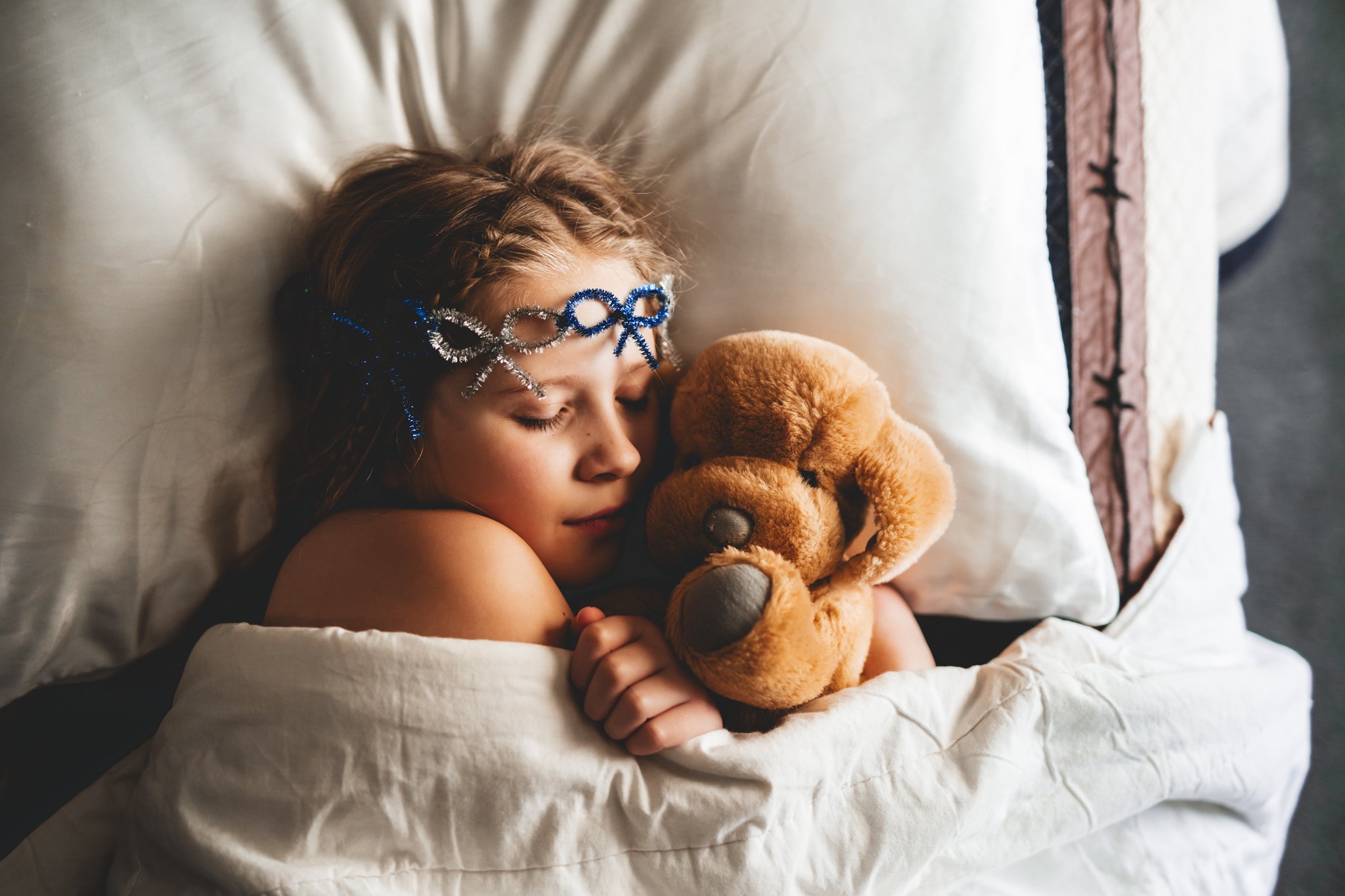 I honestly just showed up with my camera! We shot this in Ben’s bedroom at the foot of his bed! I love the way the blinds filtered in the light. It made for such a comfy, cozy morning view as she snuggled her dad’s old stuffed puppy. We also used her birthday bear she got last year!