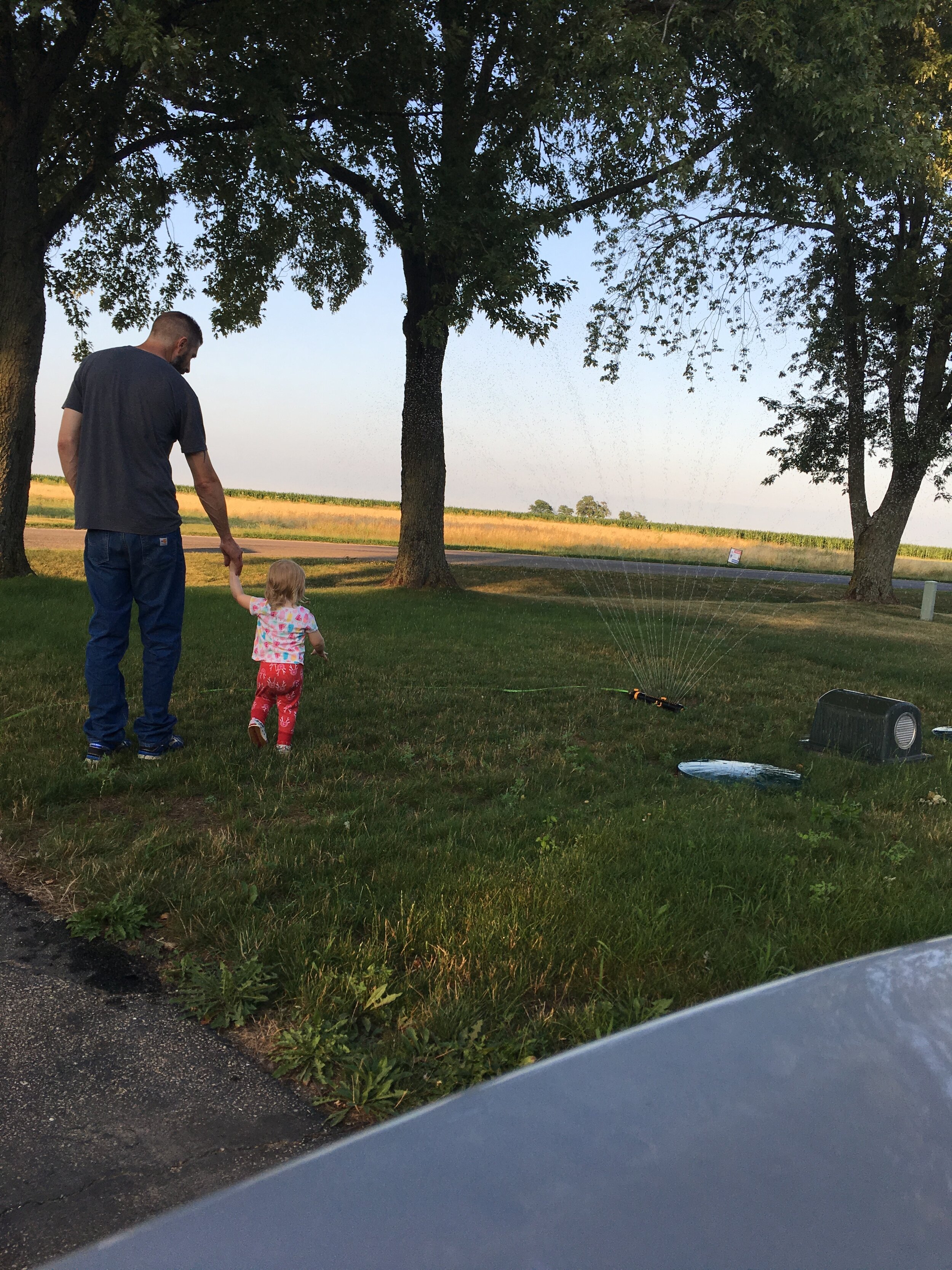 We have been watering our yard to try to save the grass we planted earlier this Spring. Waylin noticed the sprinkler and was very curious about it. I encouraged her to go check it out, and as soon as I did, Ben said he didn’t think that was a good idea. I feel like Waylin picked up on his hesitation, so she grabbed his hand and pulled him towards the sprinkler as if to tell him, “Dad, this is going to be fun and I want you to have fun too.”