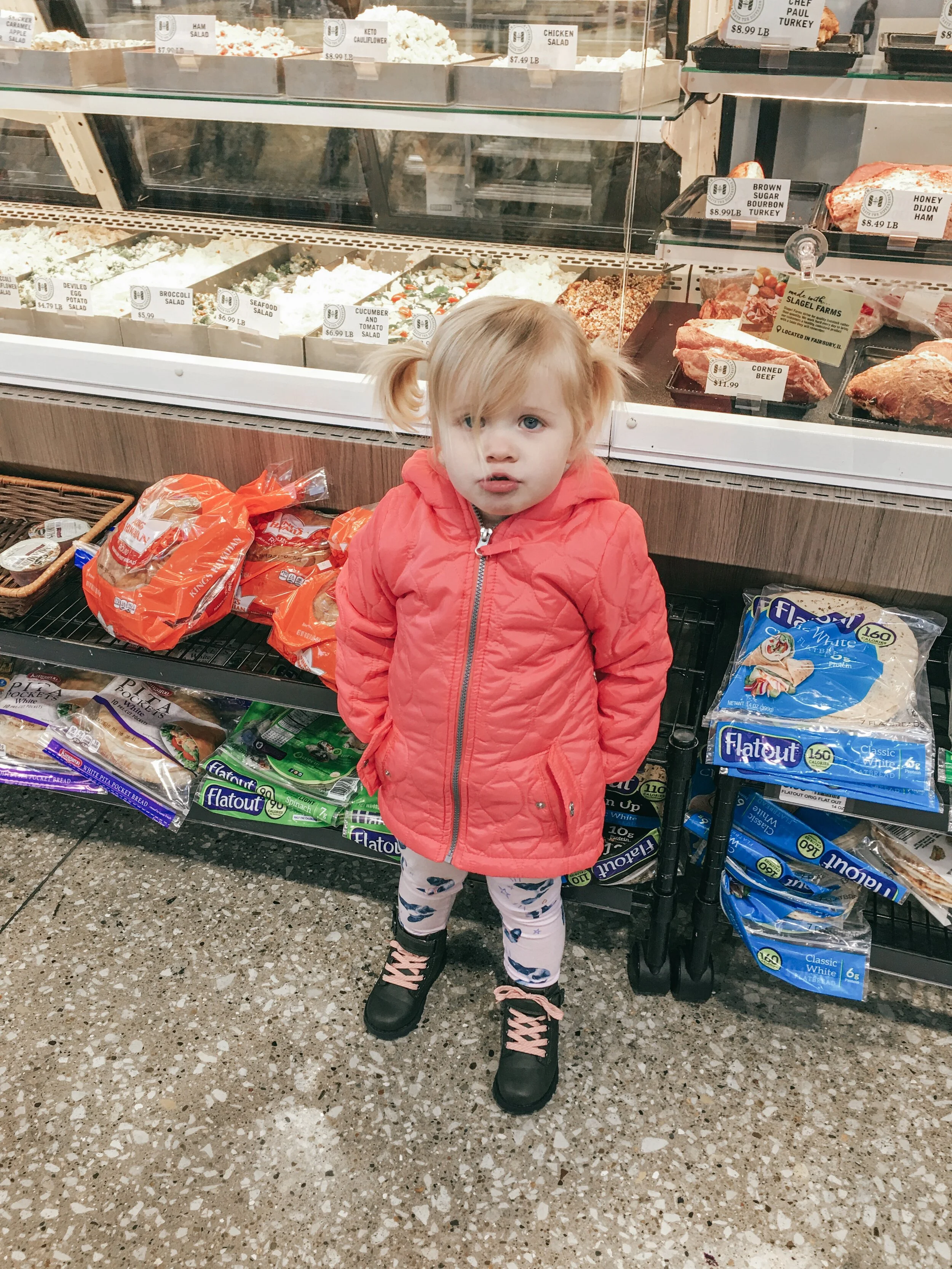 We said our goodbyes and left to go grocery shop on a full stomach. We’re at the age where shopping involves being in and our of the cart in different intervals. I let her push the cart and help me get groceries. She really enjoys being able to help me and she listens much better when she has a task.